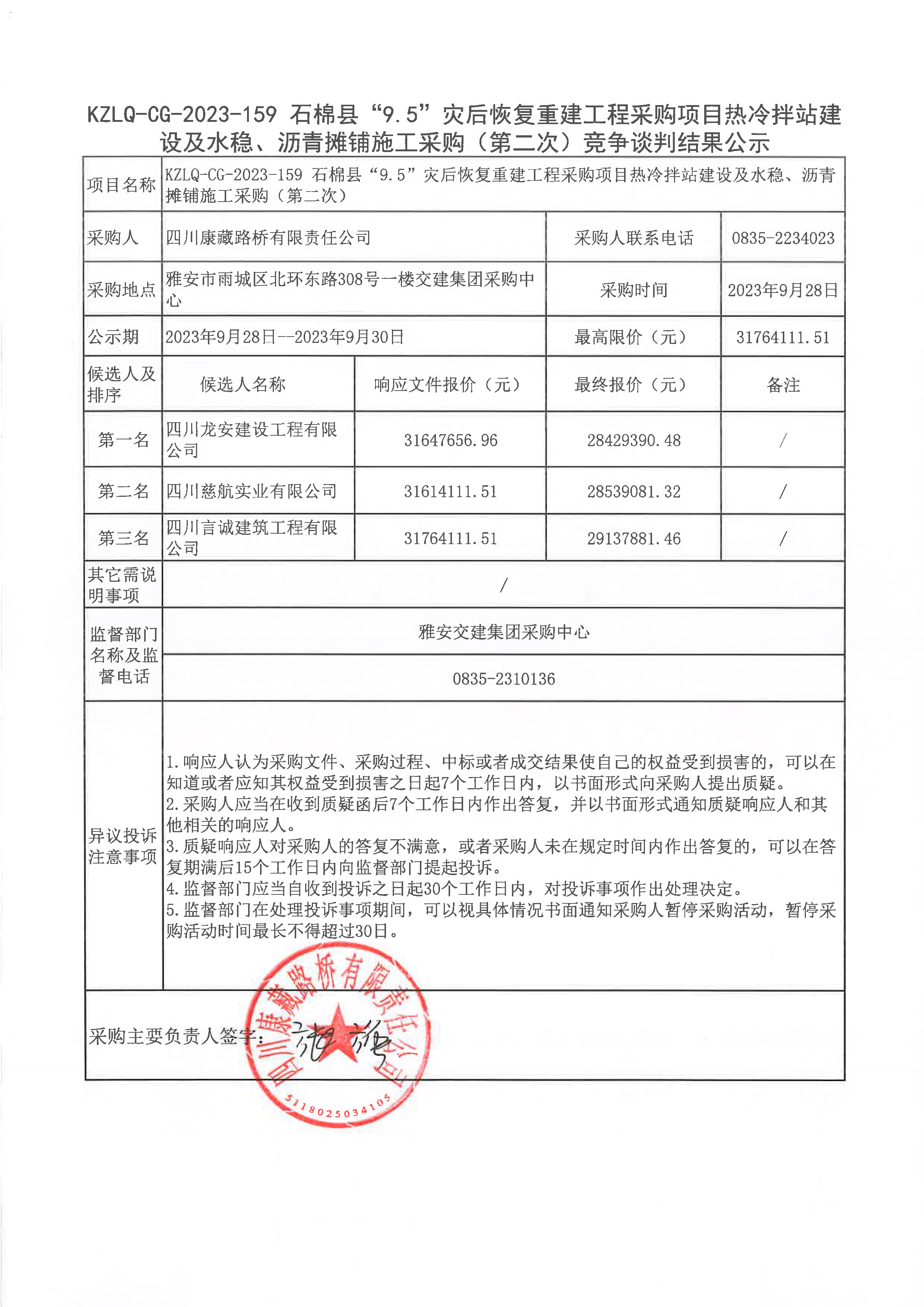 四川康藏路橋有限責(zé)任公司石棉縣“9.5”災(zāi)后恢復(fù)重建工程采購項(xiàng)目熱冷拌站建設(shè)及水穩(wěn)、瀝青攤鋪施工采購(第二次)競爭談判結(jié)果公示
