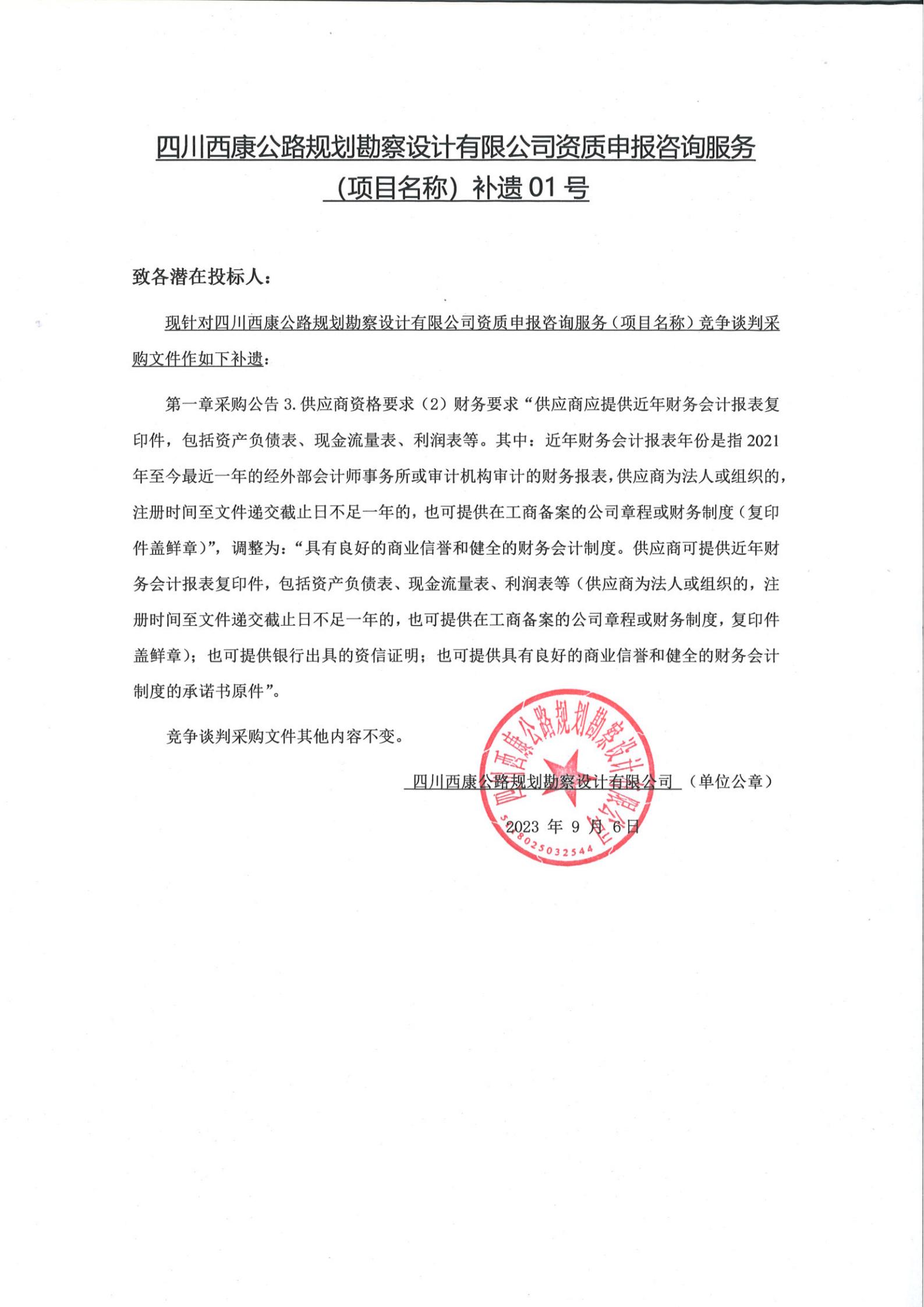 四川西康公路規(guī)劃勘察設(shè)計(jì)有限公司資質(zhì)申報(bào)咨詢服務(wù)(項(xiàng)目名稱)補(bǔ)遺01號