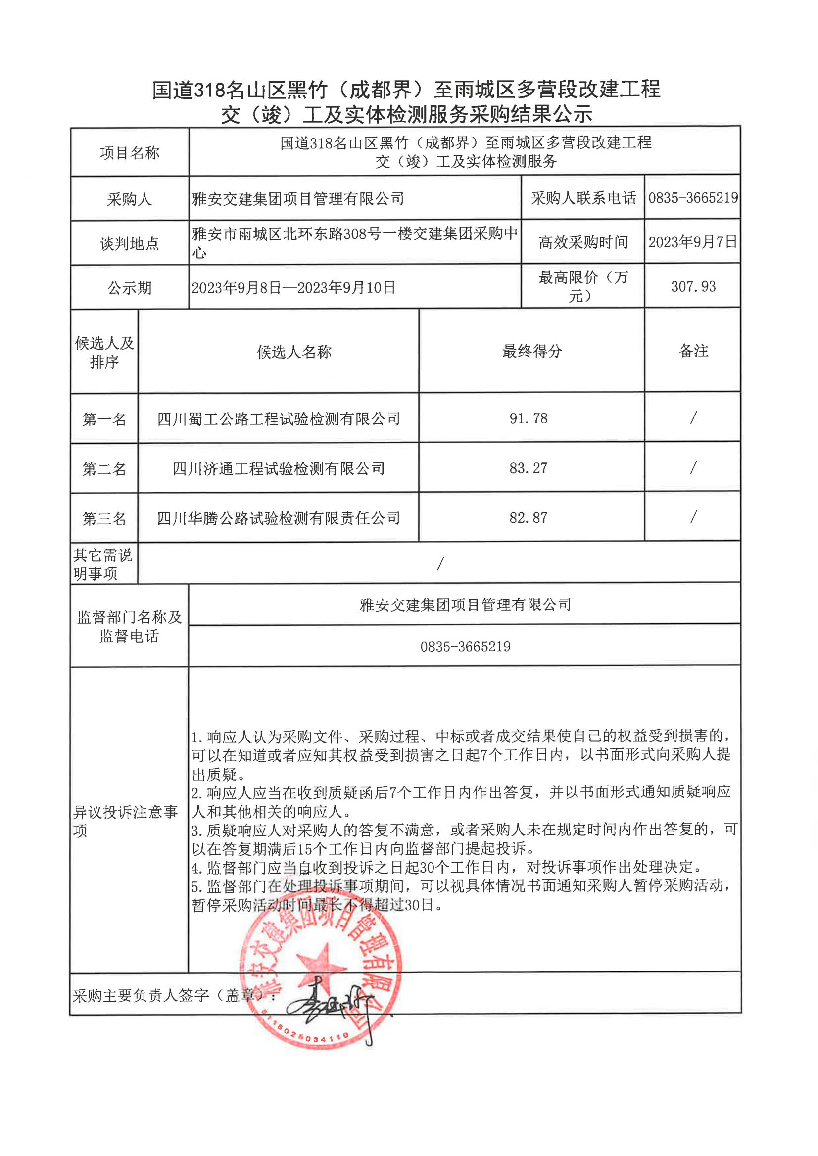 雅安交建集團(tuán)項(xiàng)目管理有限公司國道318名山區(qū)黑竹(成都界)至雨城區(qū)多營(yíng)段改建工程交(竣)工及實(shí)體檢測(cè)服務(wù)采購結(jié)果公示