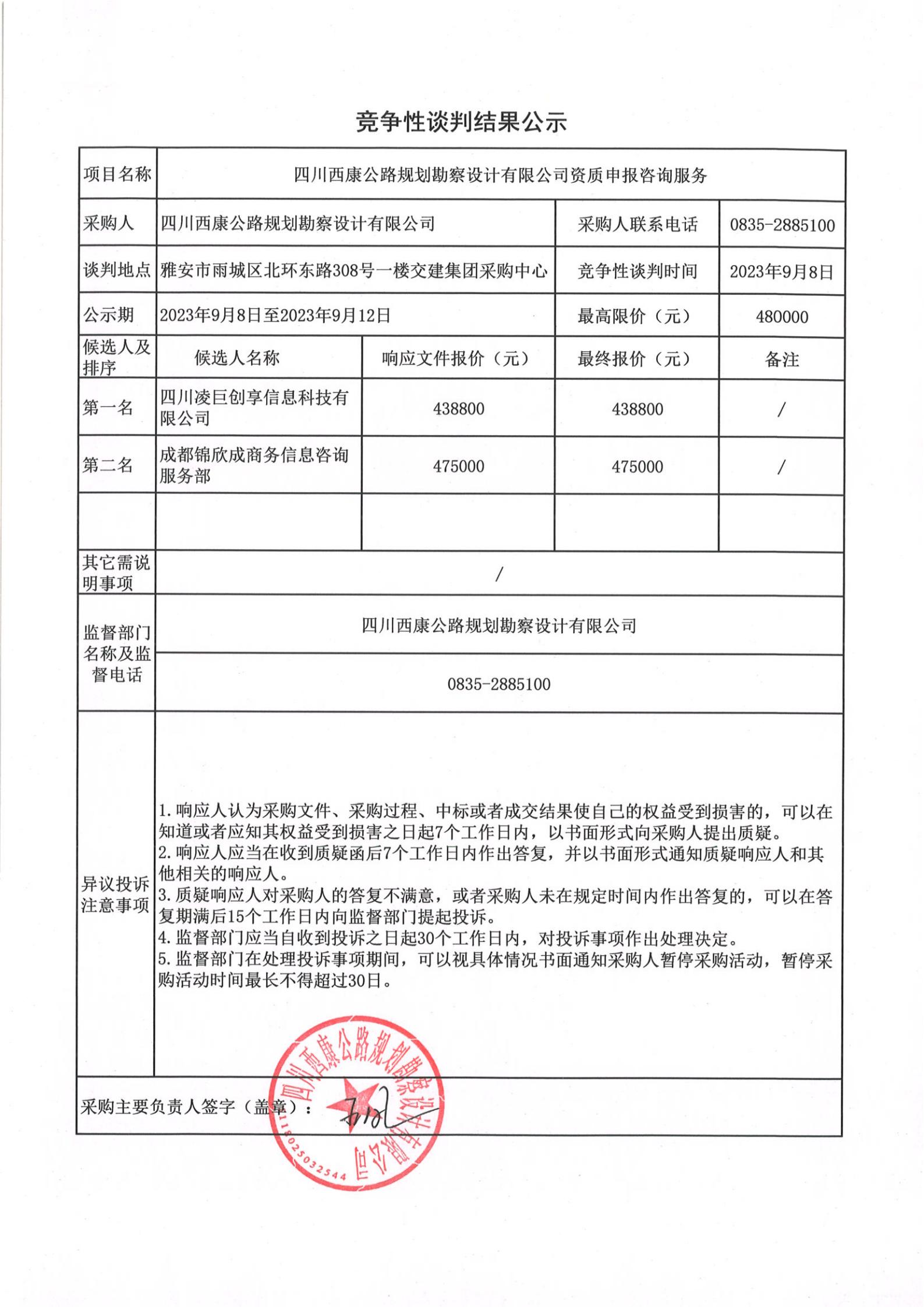 四川西康公路規(guī)劃勘察設(shè)計(jì)有限公司資質(zhì)申報咨詢服務(wù)競爭談判結(jié)果公示
