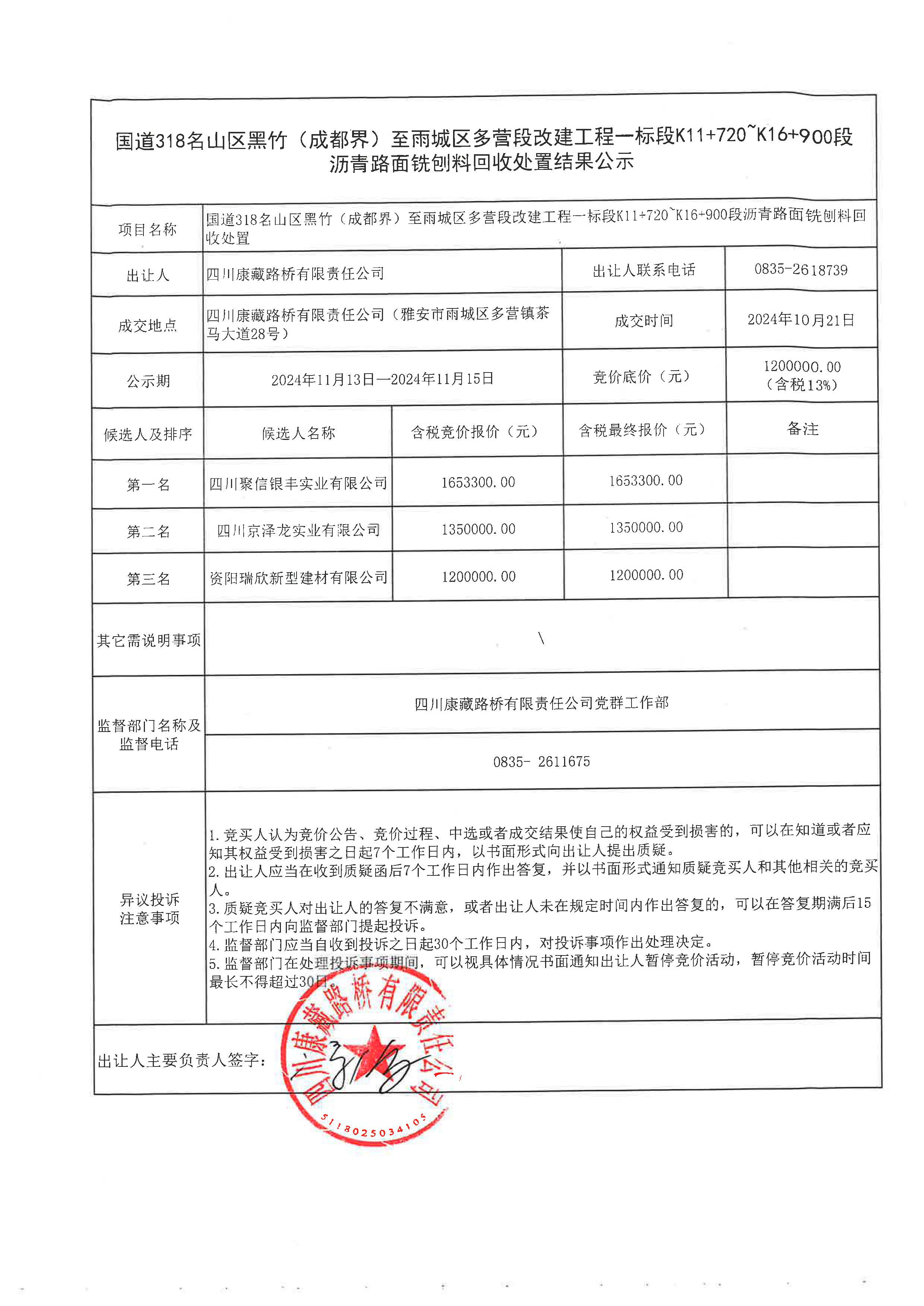 四川康藏路橋有限責(zé)任公司國(guó)道318名山區(qū)黑竹(成都界)至雨城區(qū)多營(yíng)段改建工程一標(biāo)段K11+720~K16+900段瀝青路面銑刨料回收處置結(jié)果公示