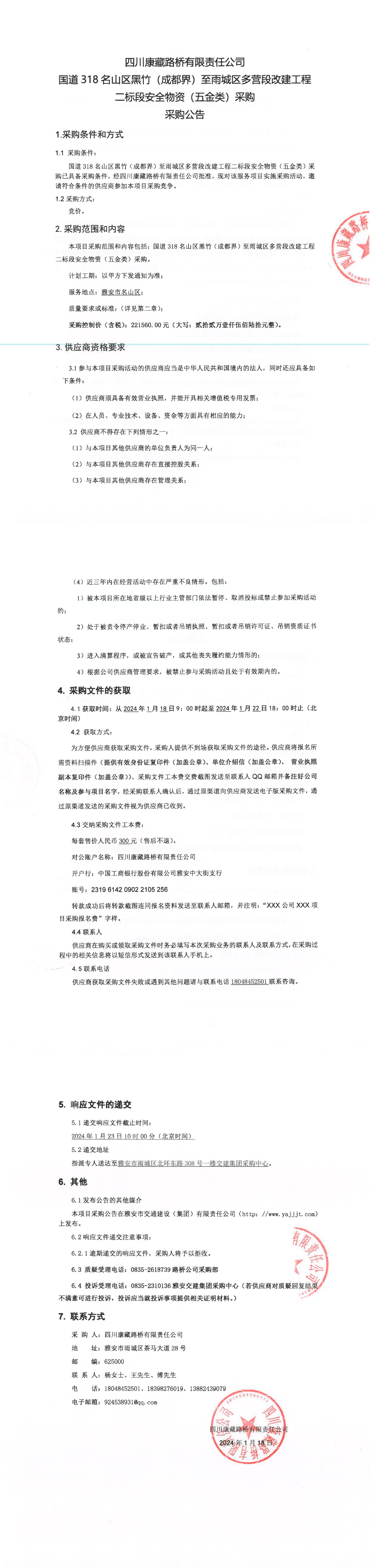 四川康藏路橋有限責(zé)任公司國道318名山區(qū)黑竹(成都界)至名山區(qū)多營段改建工程二標段安全物資(五金類)采購公告