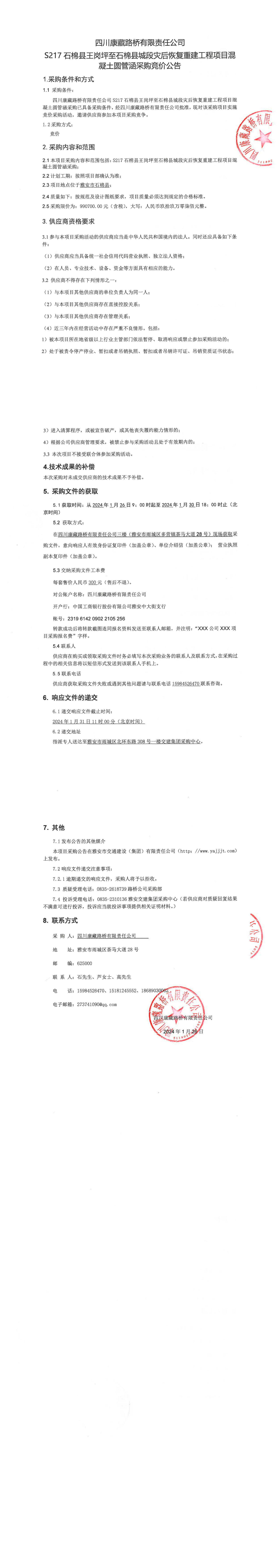 四川康藏路橋有限責任公司S217石棉縣王崗坪至石棉縣城段災后恢復重建工程項目混凝土圓管涵采購競價公告