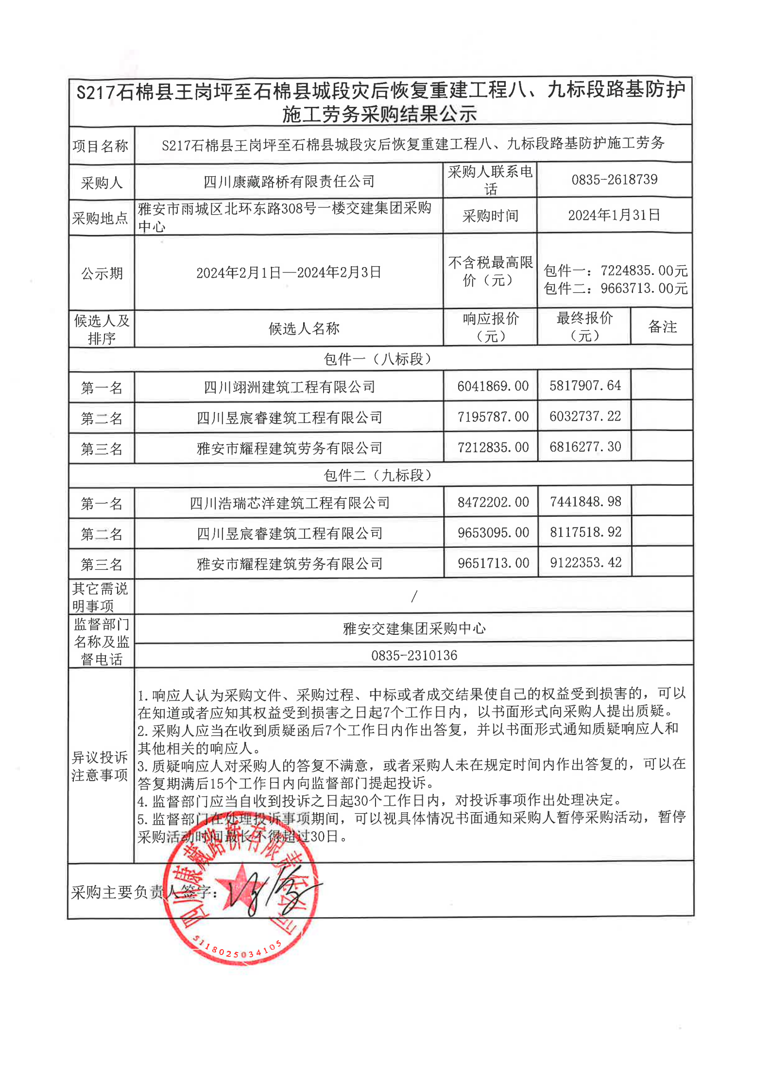 四川康藏路橋有限責任公司S217石棉縣王崗坪至石棉縣城段災后恢復重建工程八、九標段路基防護施工勞務采購結果公示