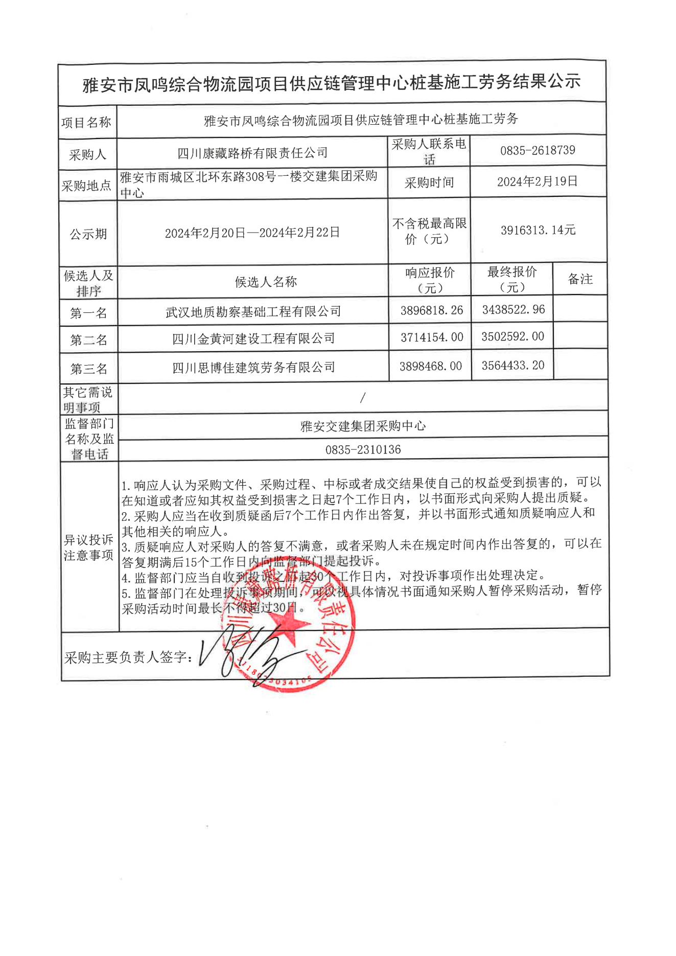 四川康藏路橋有限責(zé)任公司雅安市鳳鳴綜合物流園項目供應(yīng)鏈管理中心樁基施工勞務(wù)結(jié)果公示