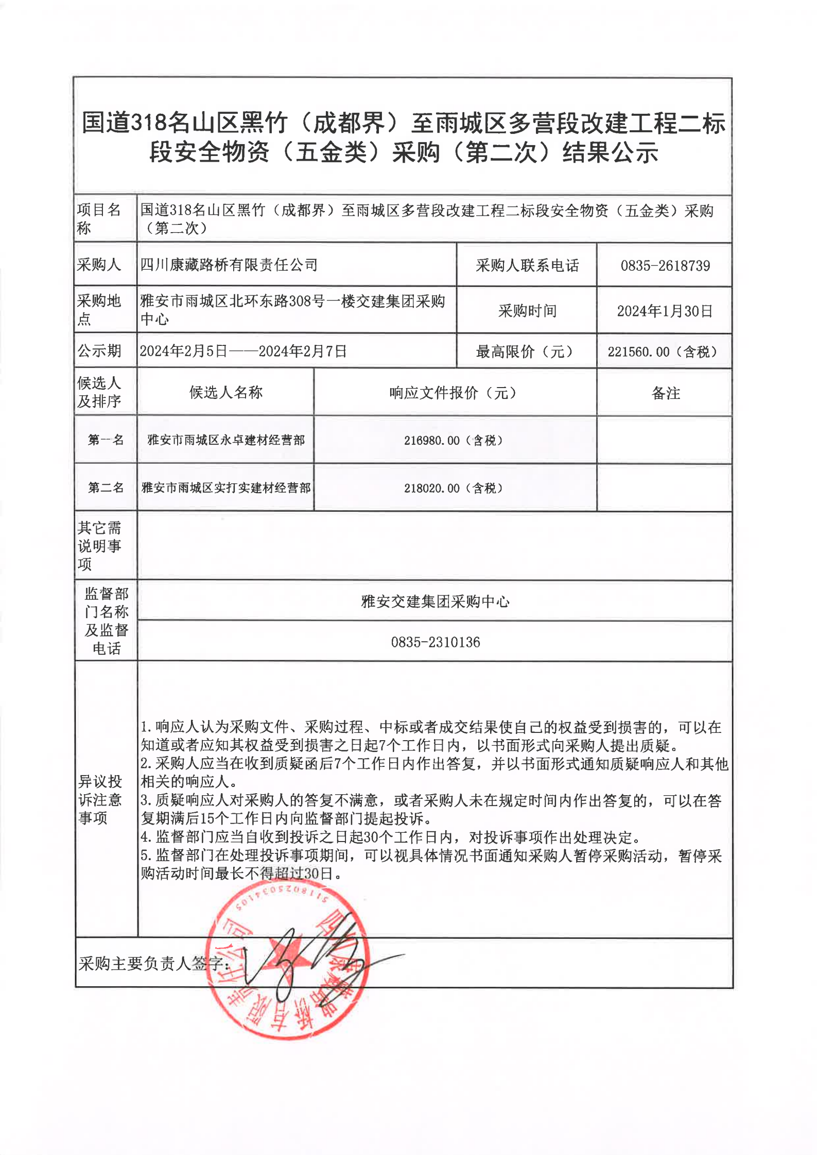 四川康藏路橋有限責(zé)任公司國道318名山區(qū)黑竹(成都界)至雨城區(qū)多營段改建工程二標(biāo)段安全物資(五金類)采購(第二次)結(jié)果公示