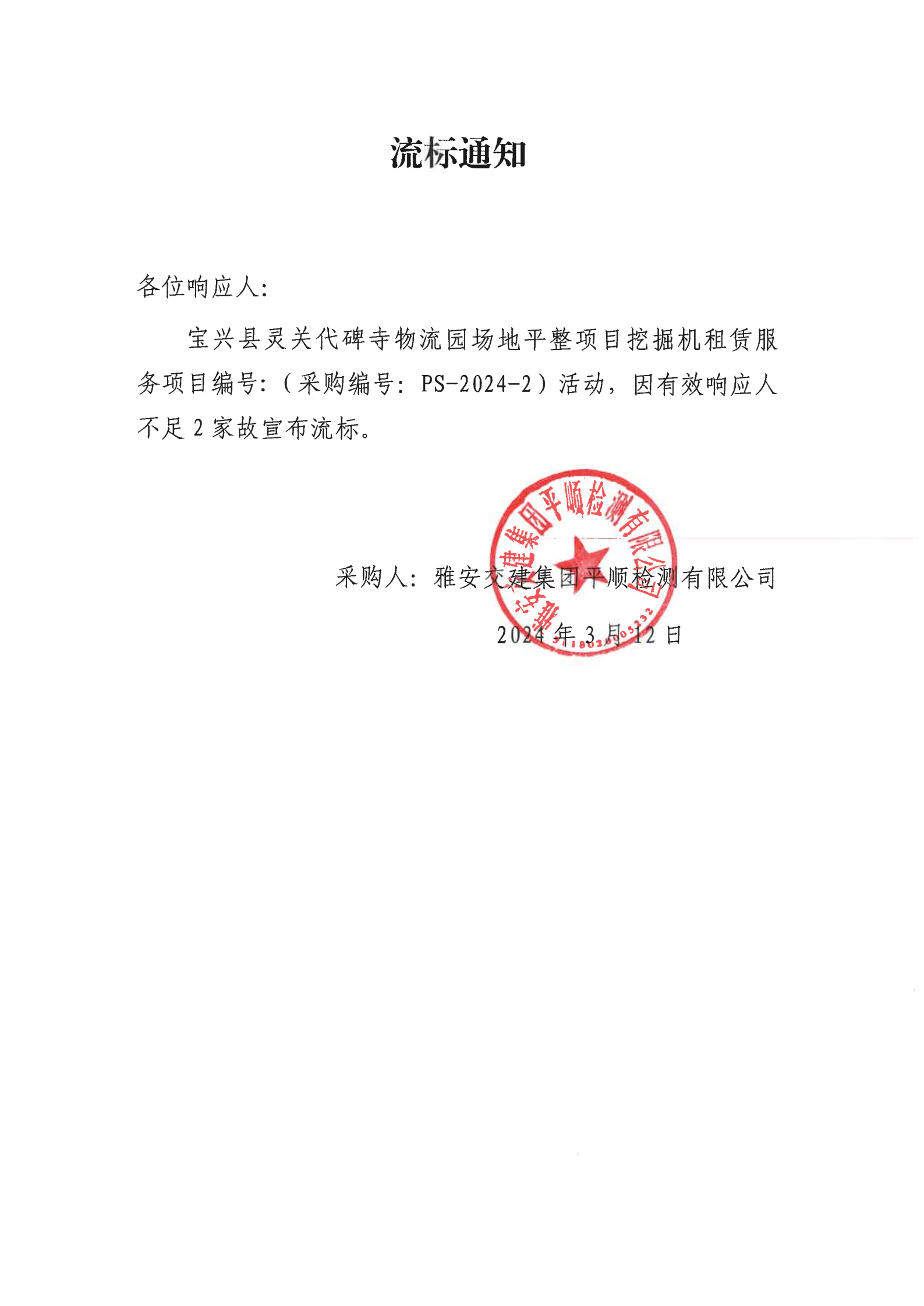 雅安交建集團(tuán)平順檢測(cè)有限公司寶興縣靈關(guān)代碑寺物流園場(chǎng)地平整項(xiàng)目挖掘機(jī)租賃服務(wù)流標(biāo)通知