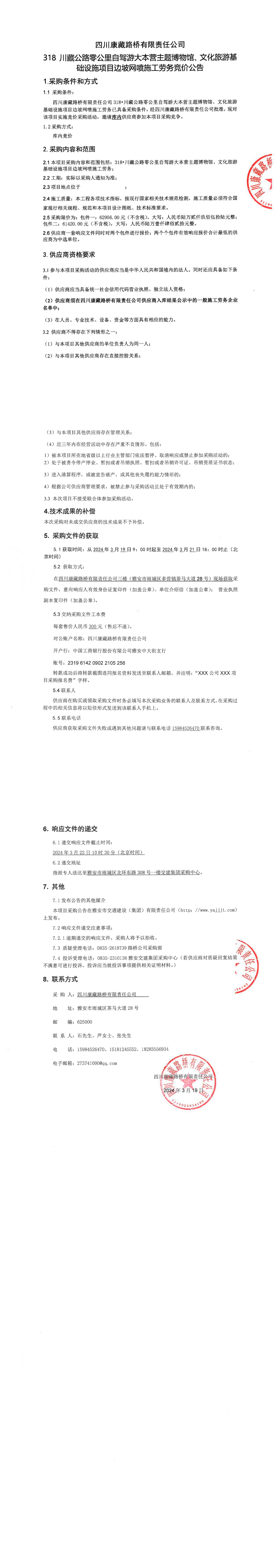 四川康藏路橋有限責任公司318•川藏公路零公里自駕游大本營主題博物館、文化旅游基礎(chǔ)設(shè)施項目邊坡網(wǎng)噴施工勞務(wù)采購公告