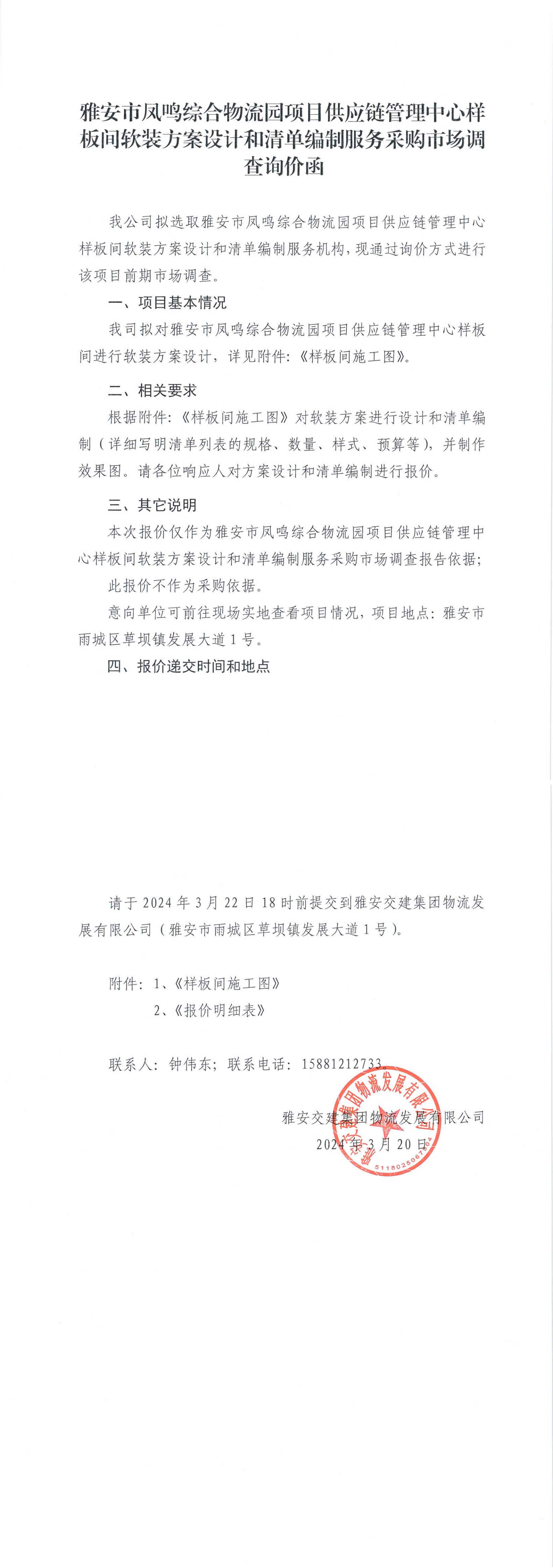 雅安交建集團(tuán)物流發(fā)展有限公司雅安市鳳鳴綜合物流園項(xiàng)目供應(yīng)鏈管理中心樣板間軟裝方案設(shè)計(jì)和清單編制服務(wù)采購市場調(diào)查詢價(jià)函