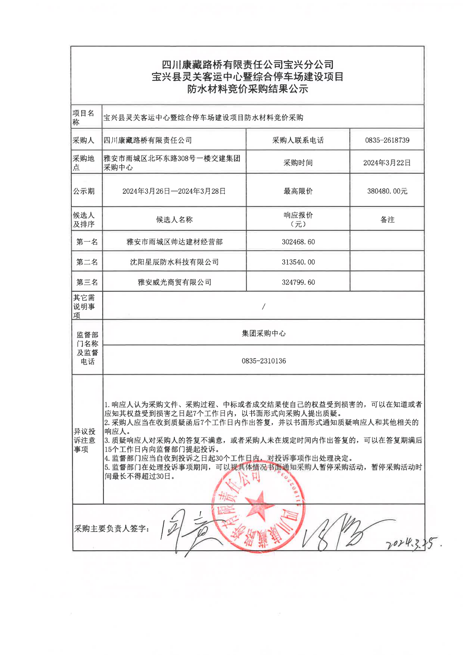 四川康藏路橋有限責(zé)任公司寶興縣靈關(guān)客運中心暨綜合停車場建設(shè)項目防水材料競價采購結(jié)果公示