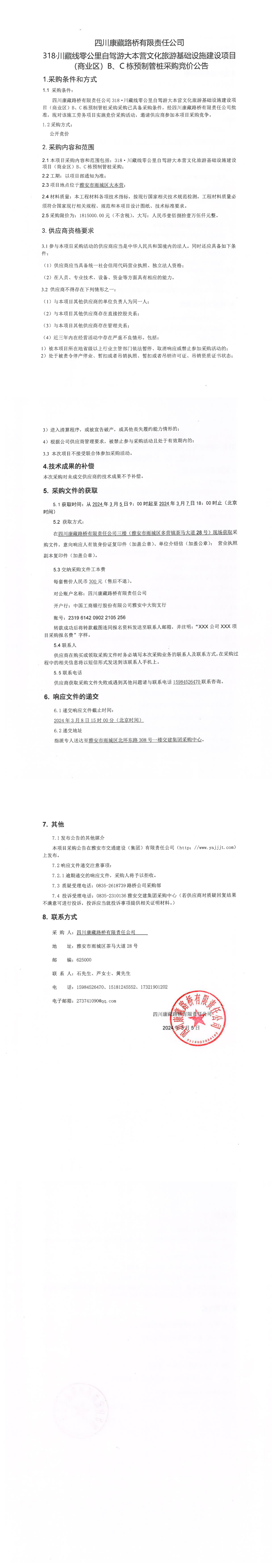 四川康藏路橋有限責任公司318·川藏公路零公里自駕游大本營文化旅游基礎(chǔ)設(shè)施建設(shè)項目(商業(yè)區(qū))B\C棟預制管樁采購競價公告