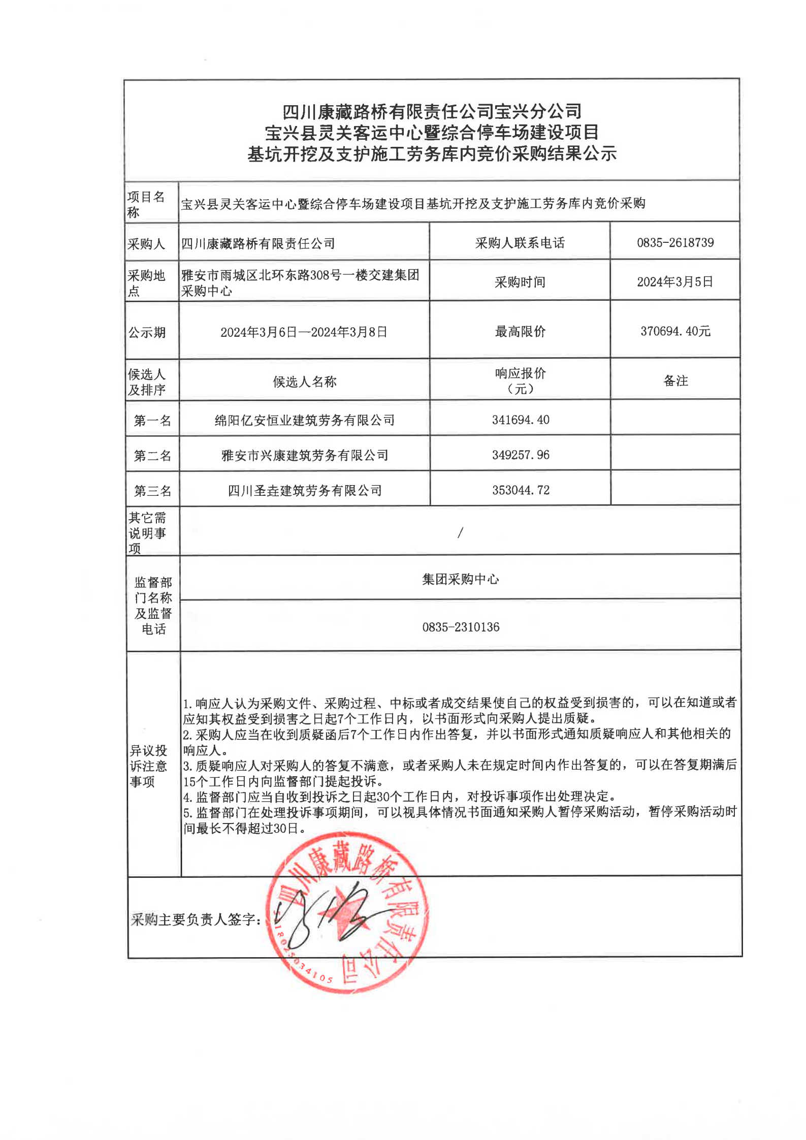四川康藏路橋有限責(zé)任公司寶興縣靈關(guān)客運(yùn)站中心暨綜合停車場建設(shè)項(xiàng)目基坑降水施工勞務(wù)庫內(nèi)競價采購結(jié)果公示
