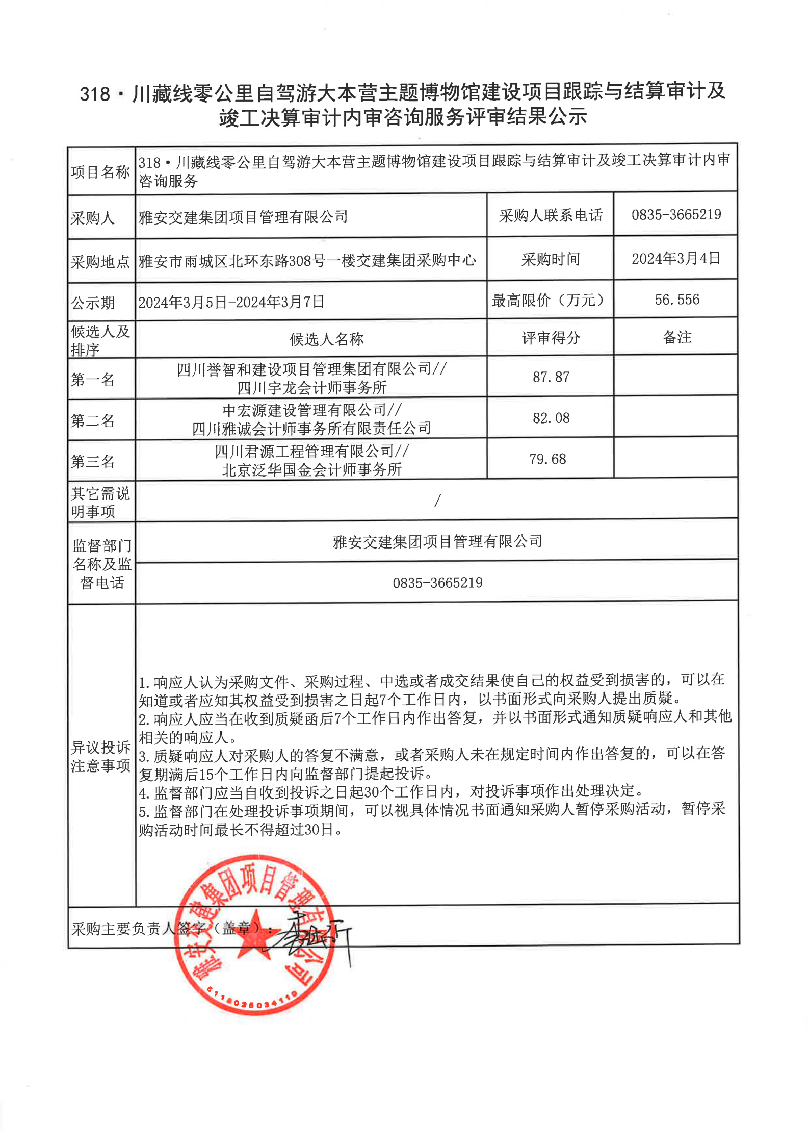 雅安交建集團項目管理有限公司318·川藏線零公里自駕游大本營主題博物館建設(shè)項目跟蹤與結(jié)算審計及竣工決算審計內(nèi)審咨詢服務(wù)評審結(jié)果公示
