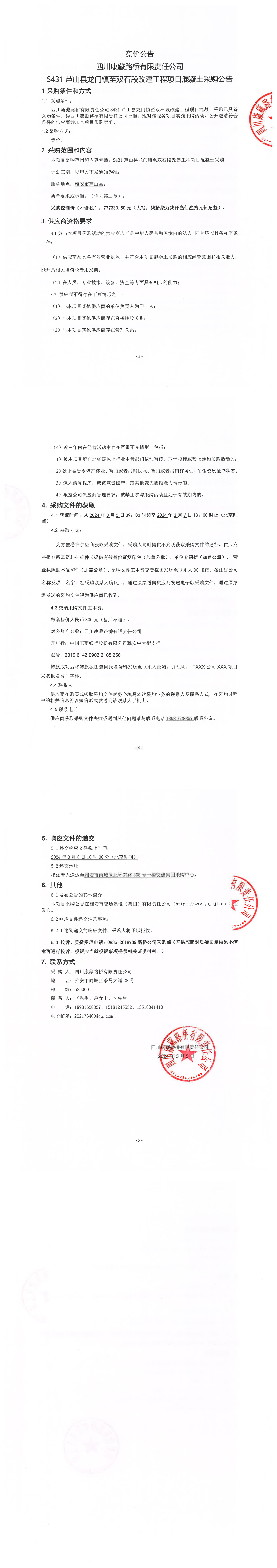 四川康藏路橋有限責任公司S431蘆山縣龍門鎮(zhèn)至雙石段改建工程項目混凝土采購公告