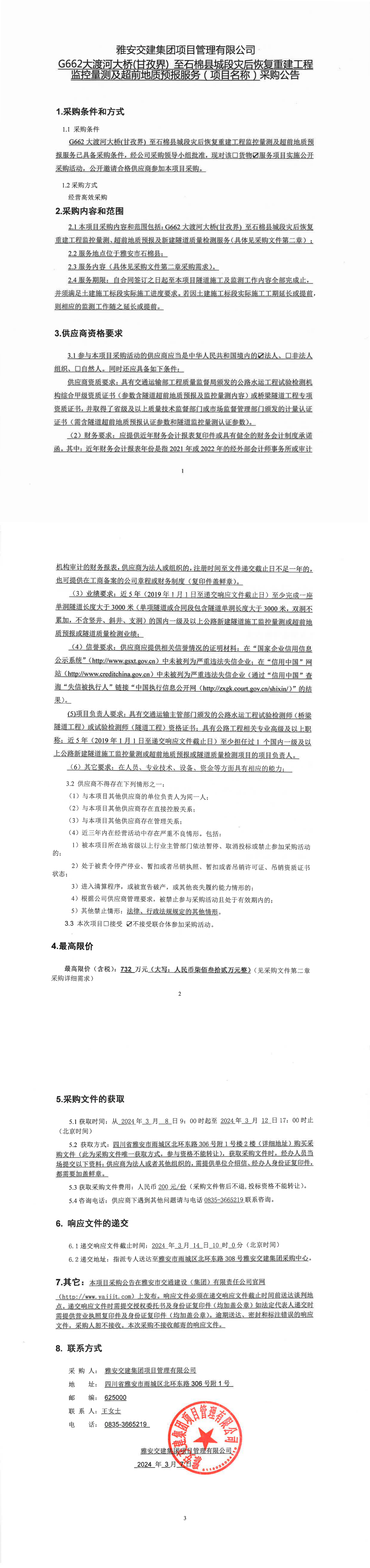 雅安交建集團項目管理有限公司G662大渡河大橋(甘孜界)至石棉縣城段災(zāi)后恢復(fù)重建工程監(jiān)控量測及超前地質(zhì)預(yù)報服務(wù)(項目名稱)采購公告
