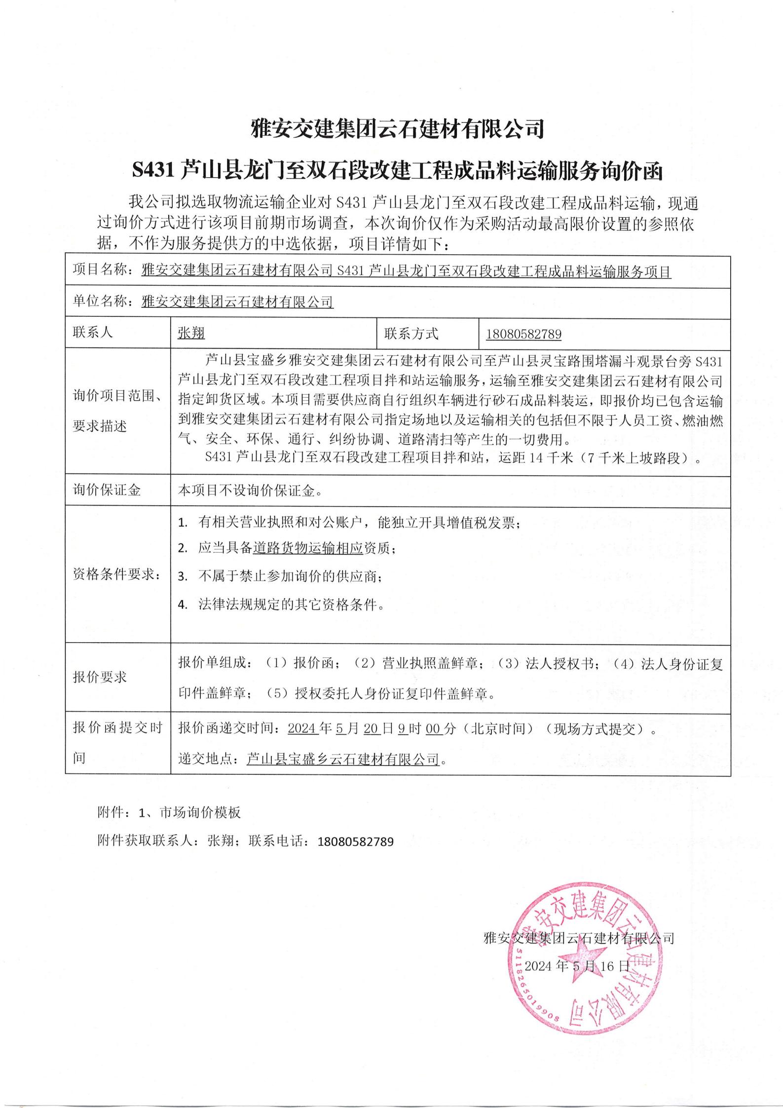 雅安交建集團(tuán)云石建材有限公司S431蘆山縣龍門(mén)至雙石段改建工程成品料運(yùn)輸服務(wù)項(xiàng)目詢(xún)價(jià)函