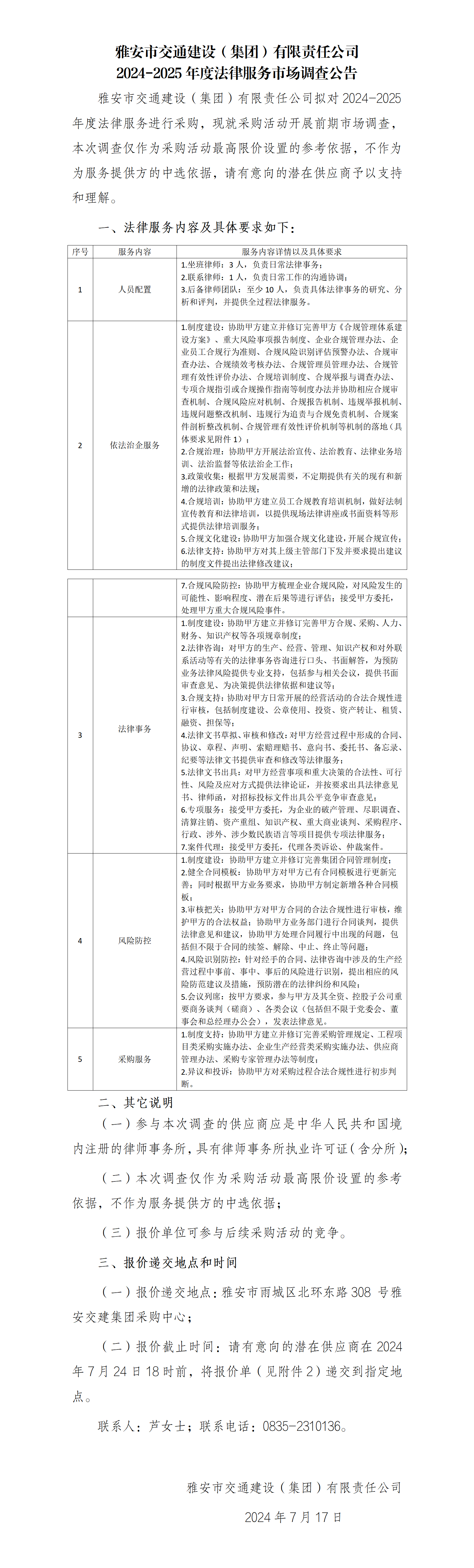 雅安市交通建設(shè)(集團(tuán))有限責(zé)任公司2024-2025年度法律服務(wù)市場調(diào)查公告