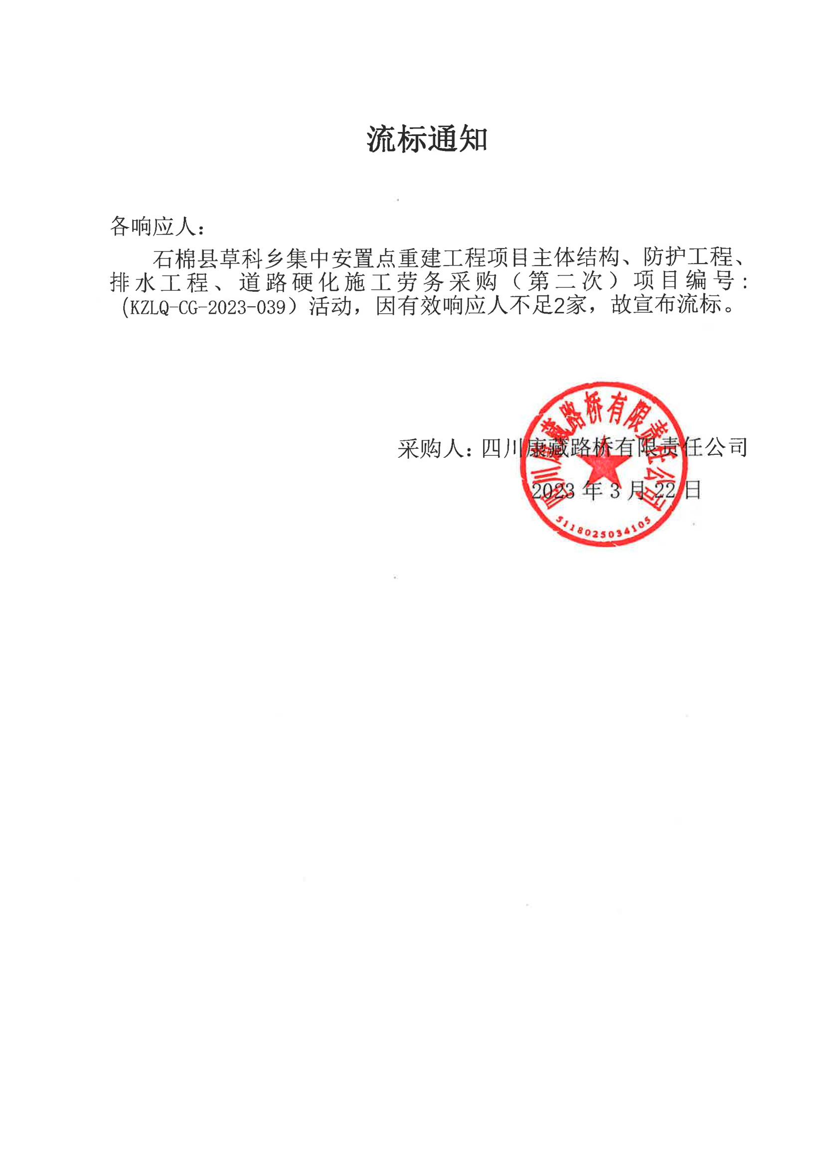 四川康藏路橋有限責(zé)任公司石棉草科鄉(xiāng)集中安置點重建工程項目主體結(jié)構(gòu)、防護工程、排水工程、道路硬化施工勞務(wù)采購流標通知(第二次)
