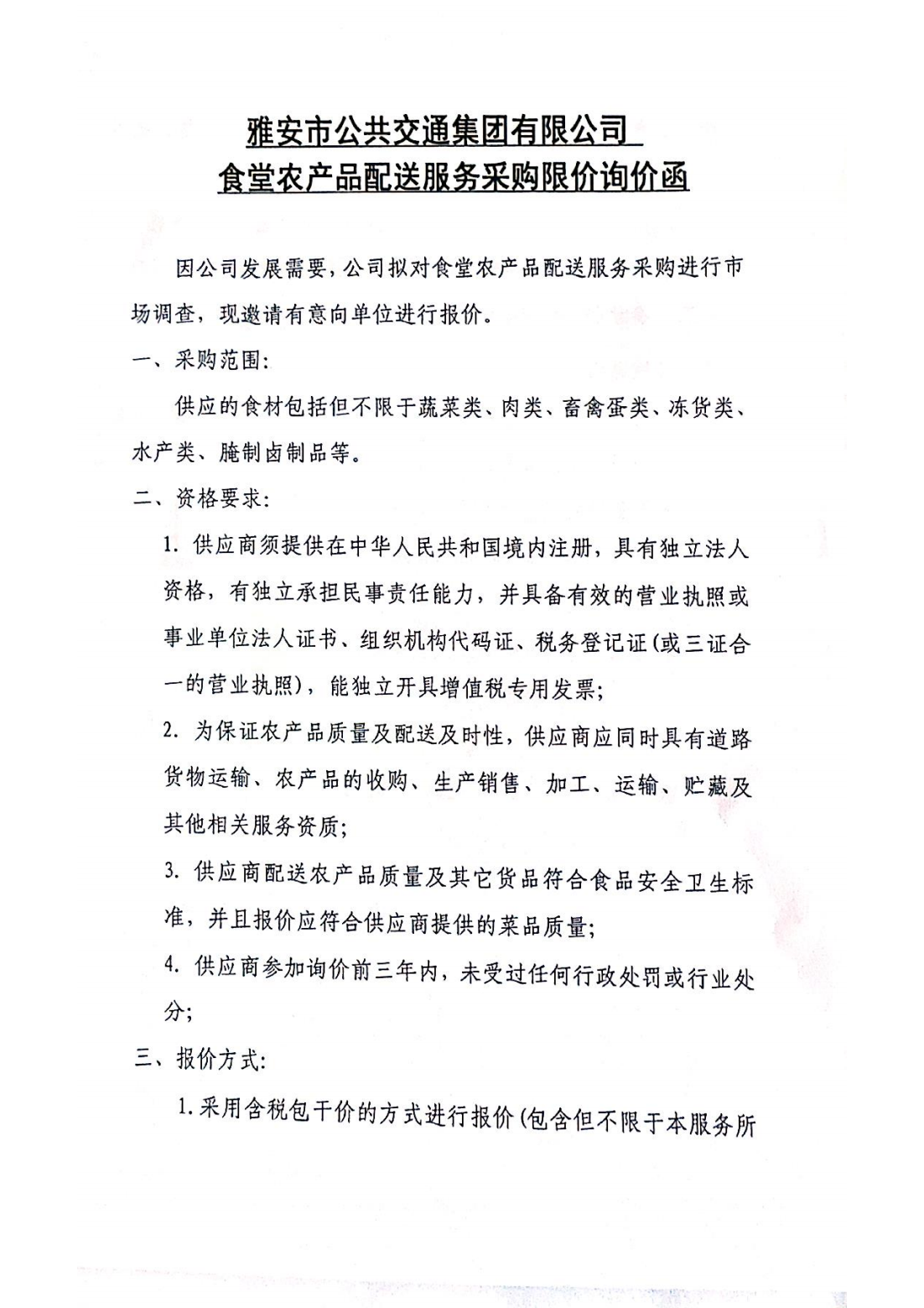 關于雅安市公共交通集團有限公司食堂農產品配送服務采購限價的詢價函
