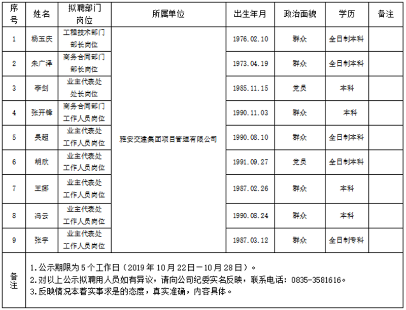 雅安交建集團項目管理有限公司擬聘用人員公示(項目管理公司)