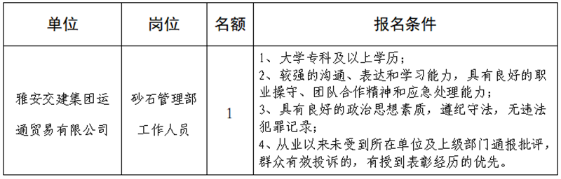 根據(jù)發(fā)展需要,決定面向社會(huì)公開招聘雅安市交通建設(shè)(集團(tuán))有限責(zé)任公司(以下簡(jiǎn)稱“雅安交建集團(tuán)”)所屬子公司工作人員1名,現(xiàn)將有關(guān)事項(xiàng)公告如下: