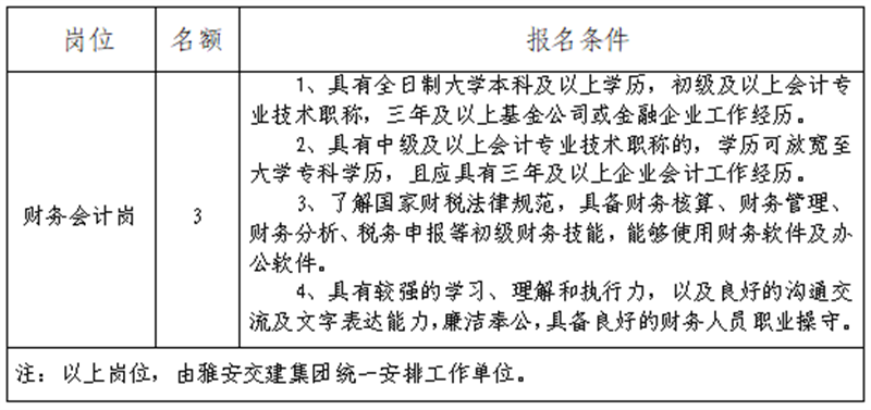 根據(jù)發(fā)展需要,決定面向社會公開招聘雅安市交通建設(shè)(集團(tuán))有限責(zé)任公司(以下簡稱“雅安交建集團(tuán)”)所屬子公司財務(wù)工作人員3名,現(xiàn)將有關(guān)事項公告如下: