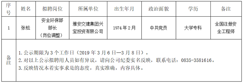 雅安交建集團子公司擬聘用人員公示(興寶公司)