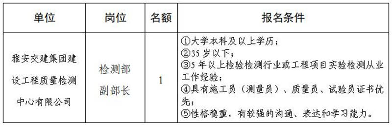 根據(jù)發(fā)展需要,決定面向社會(huì)公開(kāi)招聘雅安市交通建設(shè)(集團(tuán))有限責(zé)任公司(以下簡(jiǎn)稱“雅安交建集團(tuán)”)所屬子公司中層干部1名,現(xiàn)將有關(guān)事項(xiàng)公告如下: