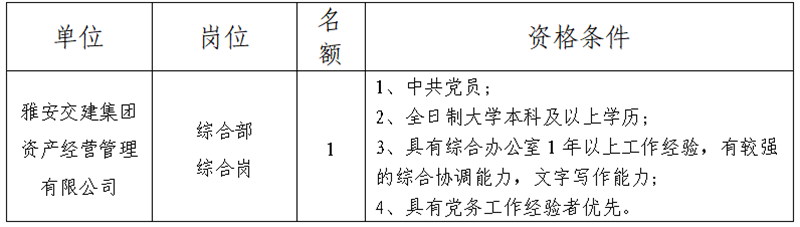 根據(jù)發(fā)展需要,決定面向社會公開招聘雅安市交通建設(shè)(集團)有限責(zé)任公司(以下簡稱“雅安交建集團”)所屬子一般工作人員1名,現(xiàn)將有關(guān)事項公告如下: