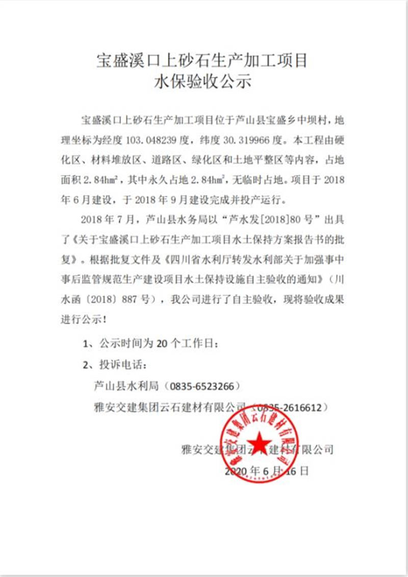 寶盛溪口上砂石生產加工項目水保驗收公示