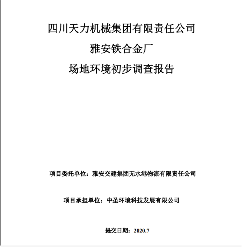 四川天力機(jī)械集團(tuán)有限責(zé)任公司——雅安鐵合金廠場地環(huán)境初步調(diào)查報(bào)告