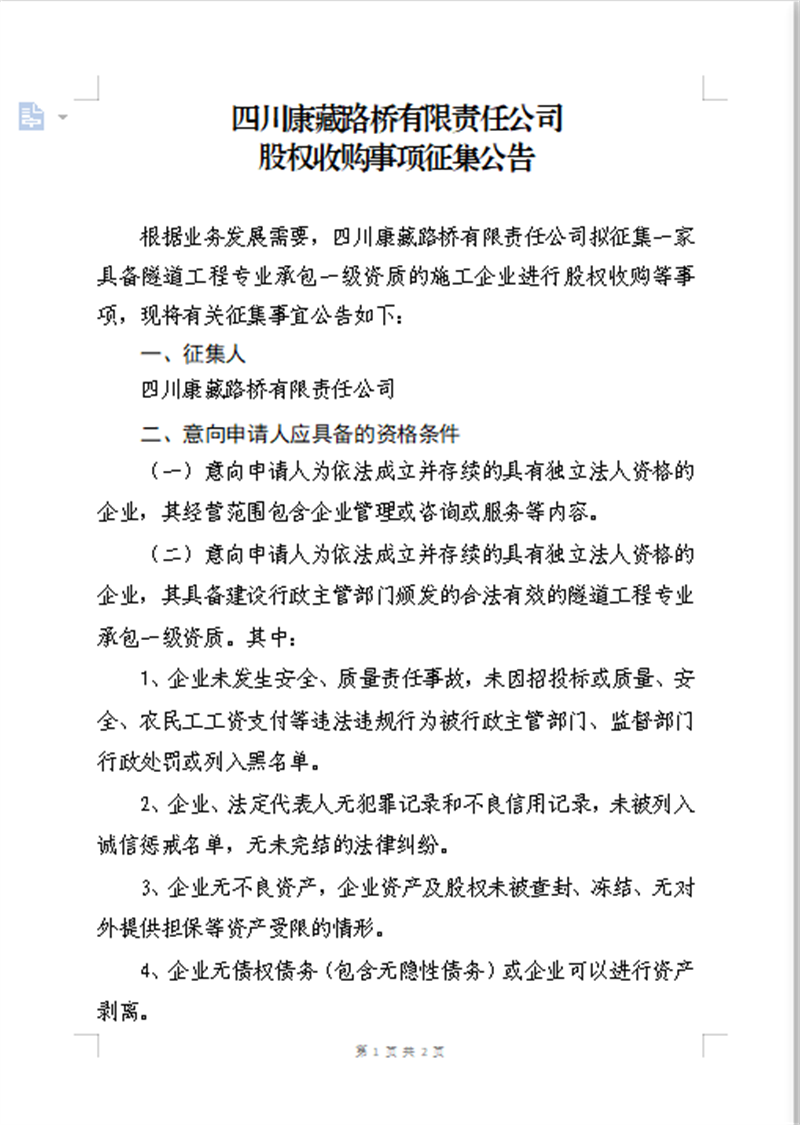 四川康藏路橋有限責任公司 股權(quán)收購事項征集公告