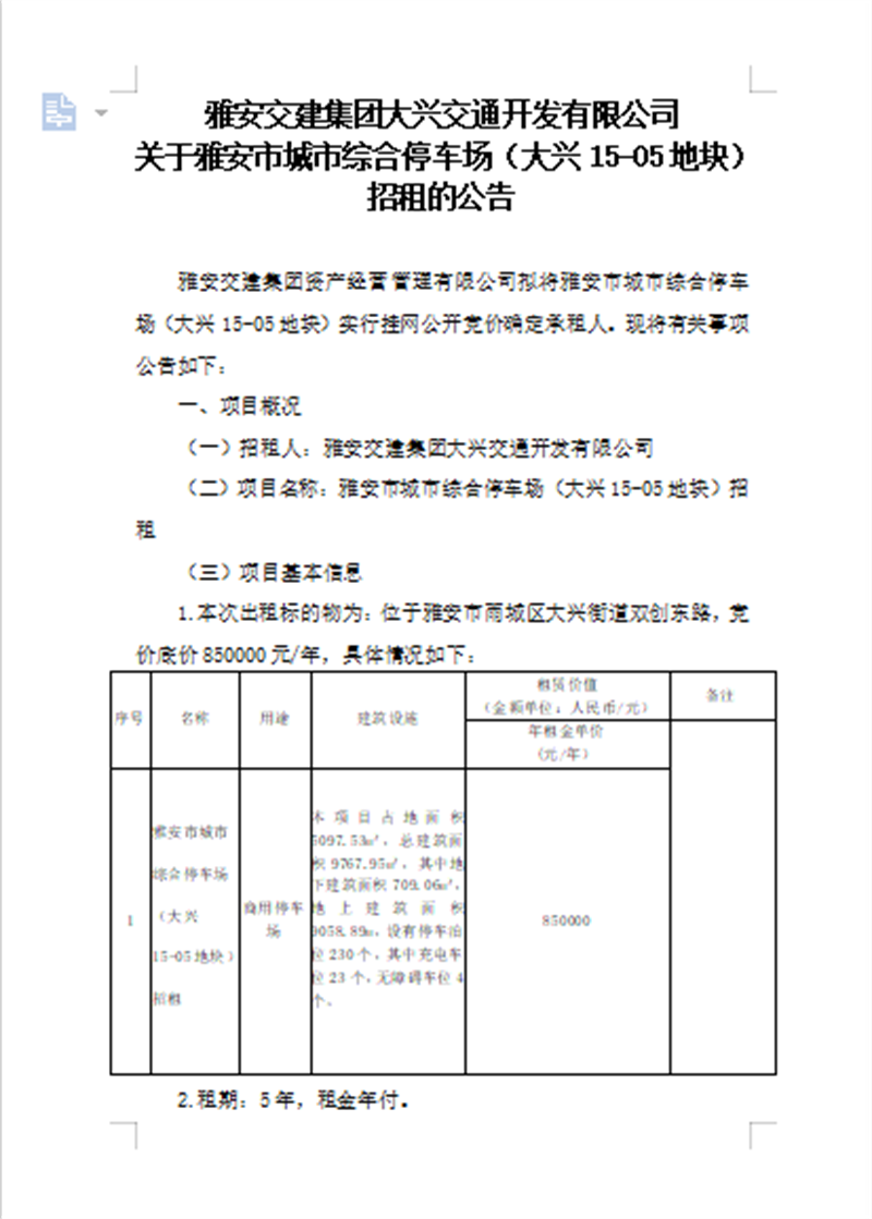 雅安交建集團大興交通開發(fā)有限公司關于雅安市城市綜合停車場(大興15-05地塊)招租的公告