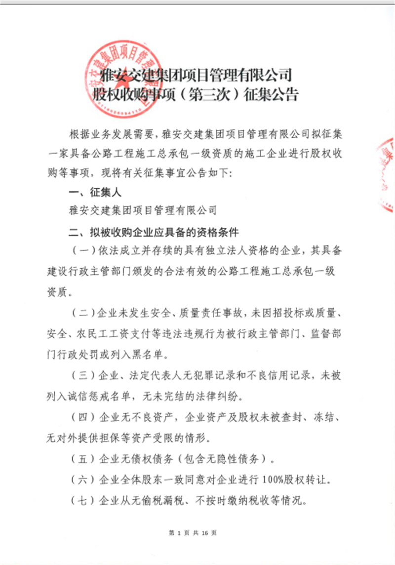 雅安交建集團項目管理有限公司股權收購事項(第三次)征集公告