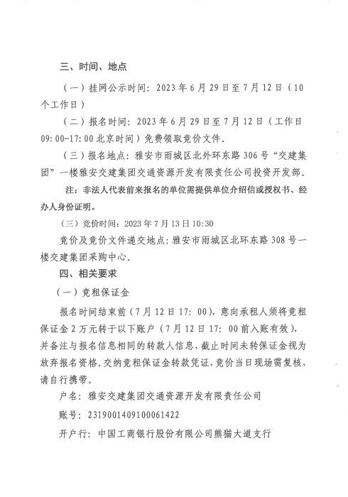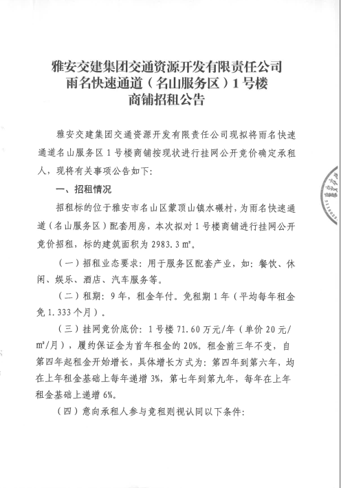 雅安交建集團(tuán)交通資源開(kāi)發(fā)有限責(zé)任公司雨名快速通道名山服務(wù)區(qū)1號(hào)樓招租公告