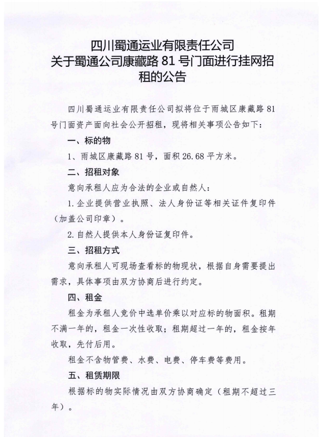 ËÄ´¨Êñͨß\˜I(y¨¨)ÓÐÏÞØŸÈι«Ë¾êP(gu¨¡n)ÓÚÊñͨ¹«Ë¾¿µ²ØÂ·81Ì–éTÃæßMÐÐ’ì¾W(w¨£ng)ÕÐ×âµÄ¹«¸æ£º¸½¼þ