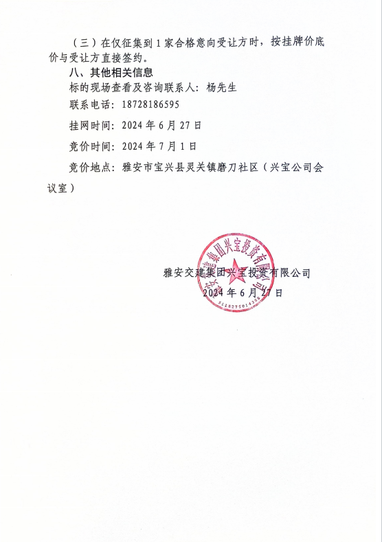 雅安交建集團興寶投資有限公司寶興縣靈關鎮(zhèn)代碑寺土地整理項目10萬噸可利用棄渣競價銷售公告(2024.6.27)
