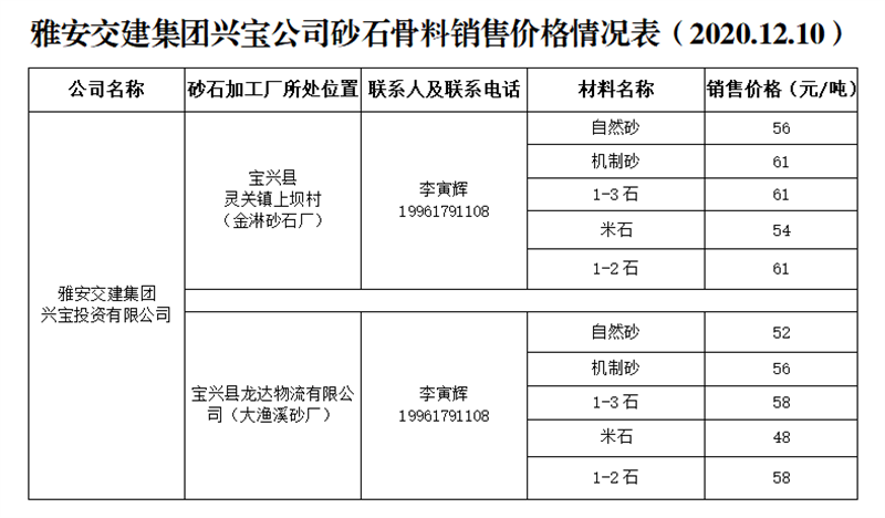 雅安交建集團(tuán)興寶公司砂石骨料銷售價(jià)格情況表(2020.12.10)