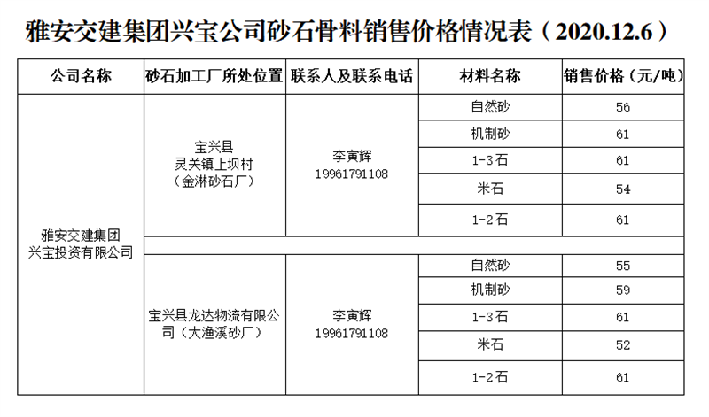 ÑŰ²½»½¨¼¯ˆF(tu¨¢n)ÅdŒš¹«Ë¾É°Ê¯¹ÇÁÏäN(xi¨¡o)ÊÛƒr(ji¨¤)¸ñÇé›r±í£¨2020.12.6£©