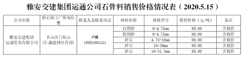 雅安交建集團(tuán)運(yùn)通公司砂石骨料銷(xiāo)售價(jià)格情況表(2020.5.15)