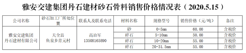 丹石建材有限公司。丹石公司是天全縣人民政府指定天全縣二郎山文化旅游投資開(kāi)發(fā)有限公司與雅安市交通建設(shè)(集團(tuán))有限責(zé)任公司共同組建的合資公司。公司通過(guò)公開(kāi)競(jìng)拍取得儲(chǔ)量2000萬(wàn)方的魚(yú)泉獅子山灰?guī)r礦,并在天全縣魚(yú)泉鄉(xiāng)青元村建立砂石骨料生產(chǎn)線,設(shè)計(jì)年產(chǎn)能200萬(wàn)噸。目前,礦山開(kāi)采項(xiàng)目處于在建階段,砂石生產(chǎn)加工廠區(qū)處于設(shè)備調(diào)試和產(chǎn)能驗(yàn)收階段。生產(chǎn)廠區(qū)距雨城區(qū)中心城區(qū)約50公里。
