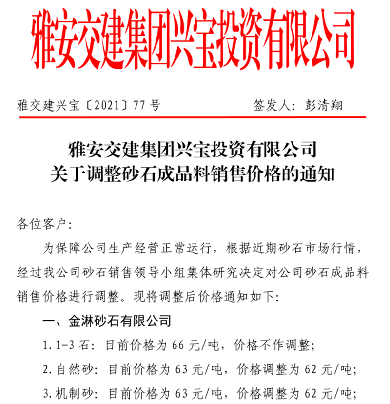 雅安交建集團云石公司關于調整成品料銷售價格的通知(2021.11.4)