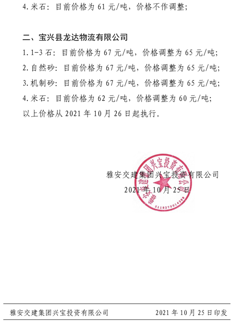 雅安交建集團丹石公司關于調整成品骨料及風化礦石料銷售價格的通知(2021.10.26)