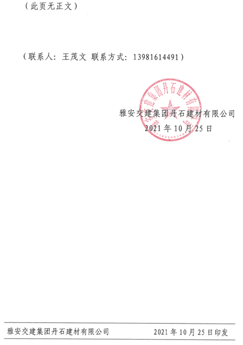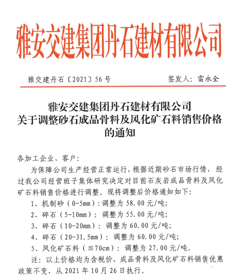 雅安交建集團(tuán)丹石公司關(guān)于調(diào)整成品骨料及風(fēng)化礦石料銷售價(jià)格的通知(2021.10.26)