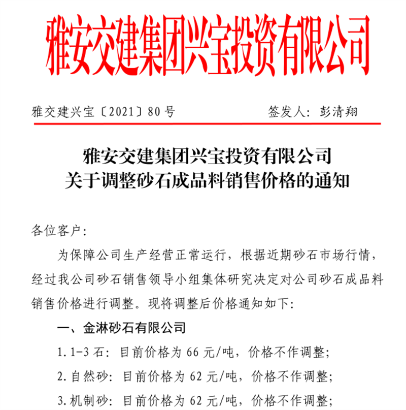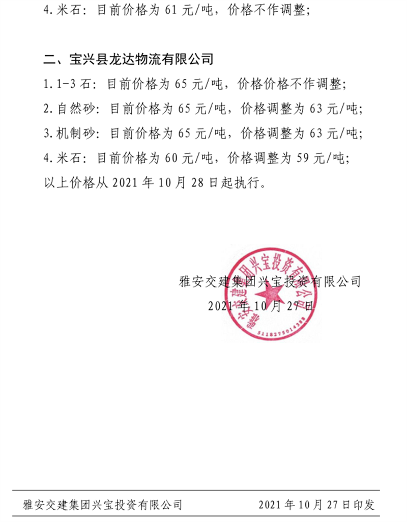 雅安交建集團興寶公司關(guān)于調(diào)整成品料銷售價格的通知(2021.10.26)