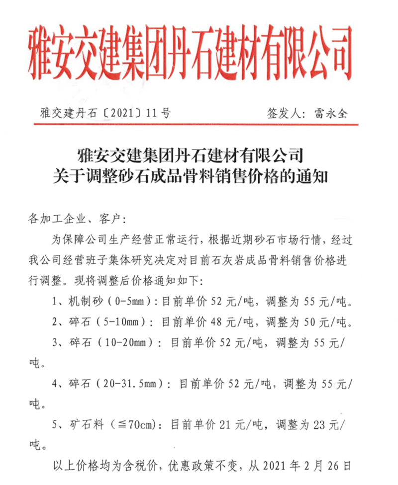 雅安交建集團(tuán)云石公司砂石骨料銷售價(jià)格情況表(2021.6.20)