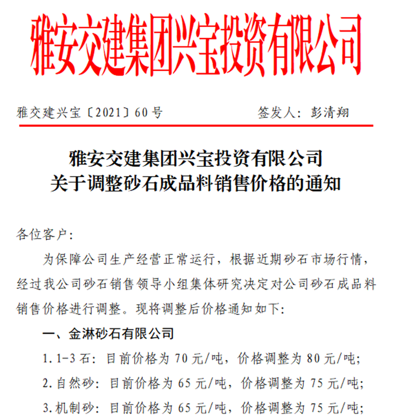 雅安交建集團(tuán)云石公司關(guān)于調(diào)整成品料銷售價格的通知(2021.11.4)