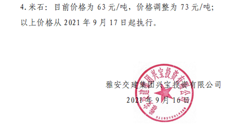 雅安交建集團(tuán)云石公司關(guān)于調(diào)整成品料銷售價格的通知(2021.9.13)