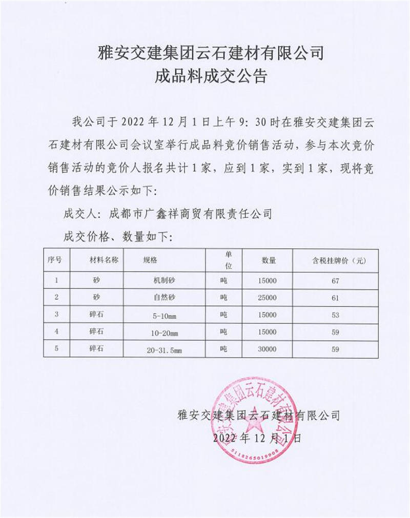 雅安交建集團(tuán)云石建材有限公司成品料競(jìng)價(jià)銷(xiāo)售成交公告(2022-12-01)