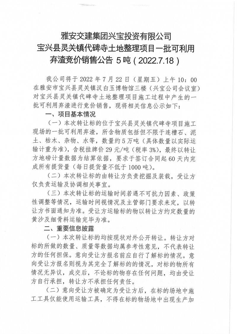 寶興縣靈關(guān)鎮(zhèn)代碑寺土地整理項目一批可利用棄渣競價銷售公告7.18(5萬噸)